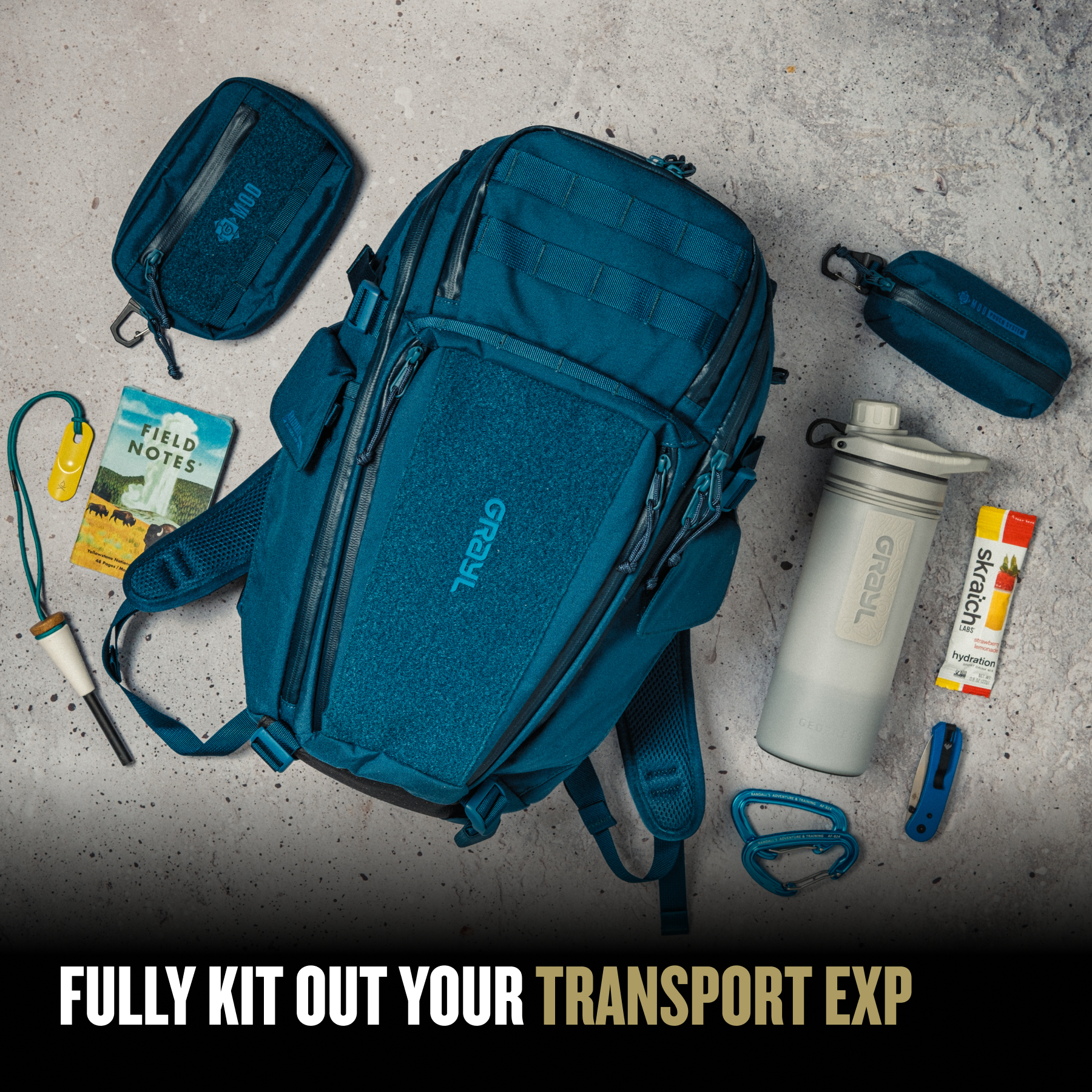 Expanse BottleDrop™ Pockets are featured on both sides of the Transport EXP Backpack. With an adjustable compression strap and flexible stretch woven panels, this pocket is perfect for a Grayl or any gear needing a secure home.