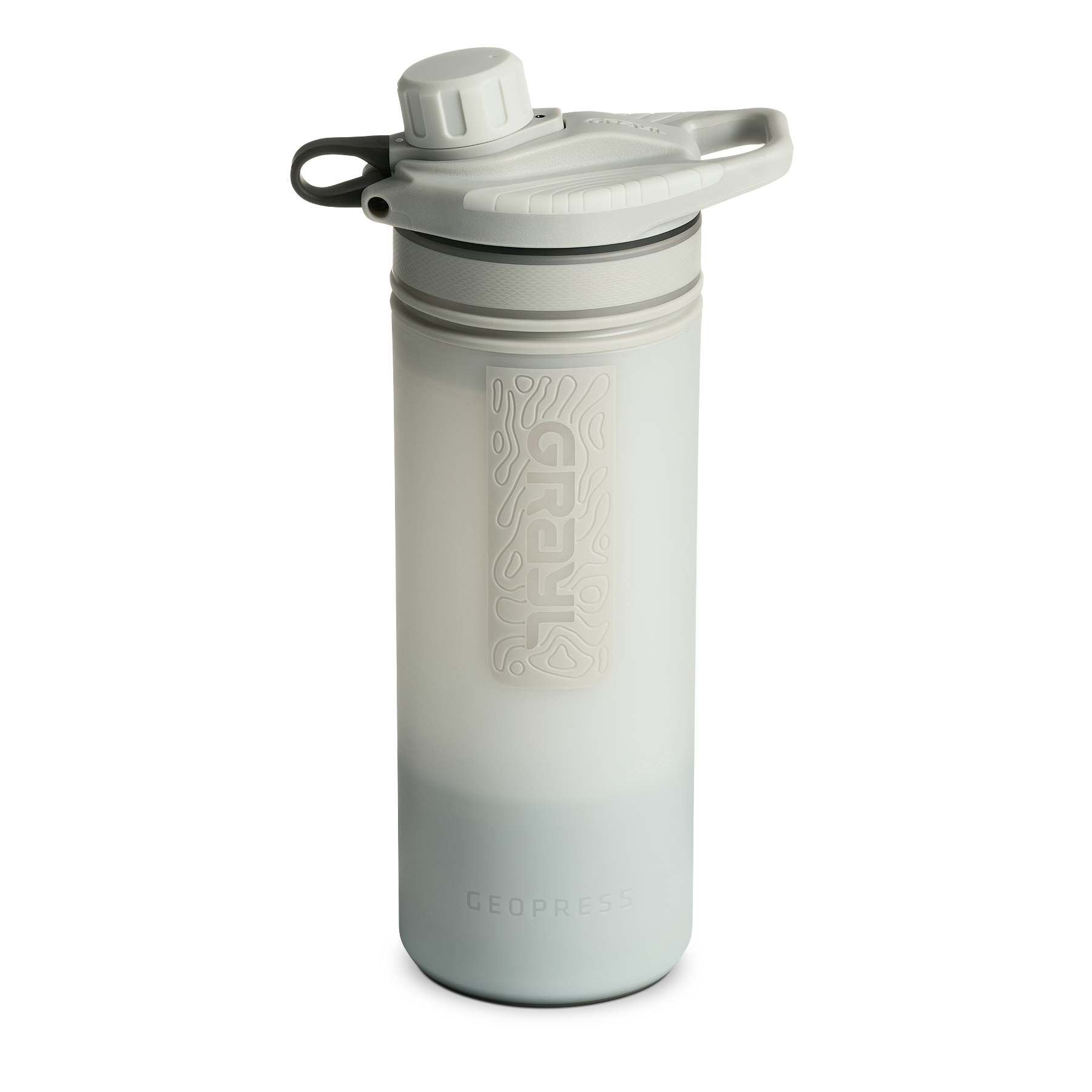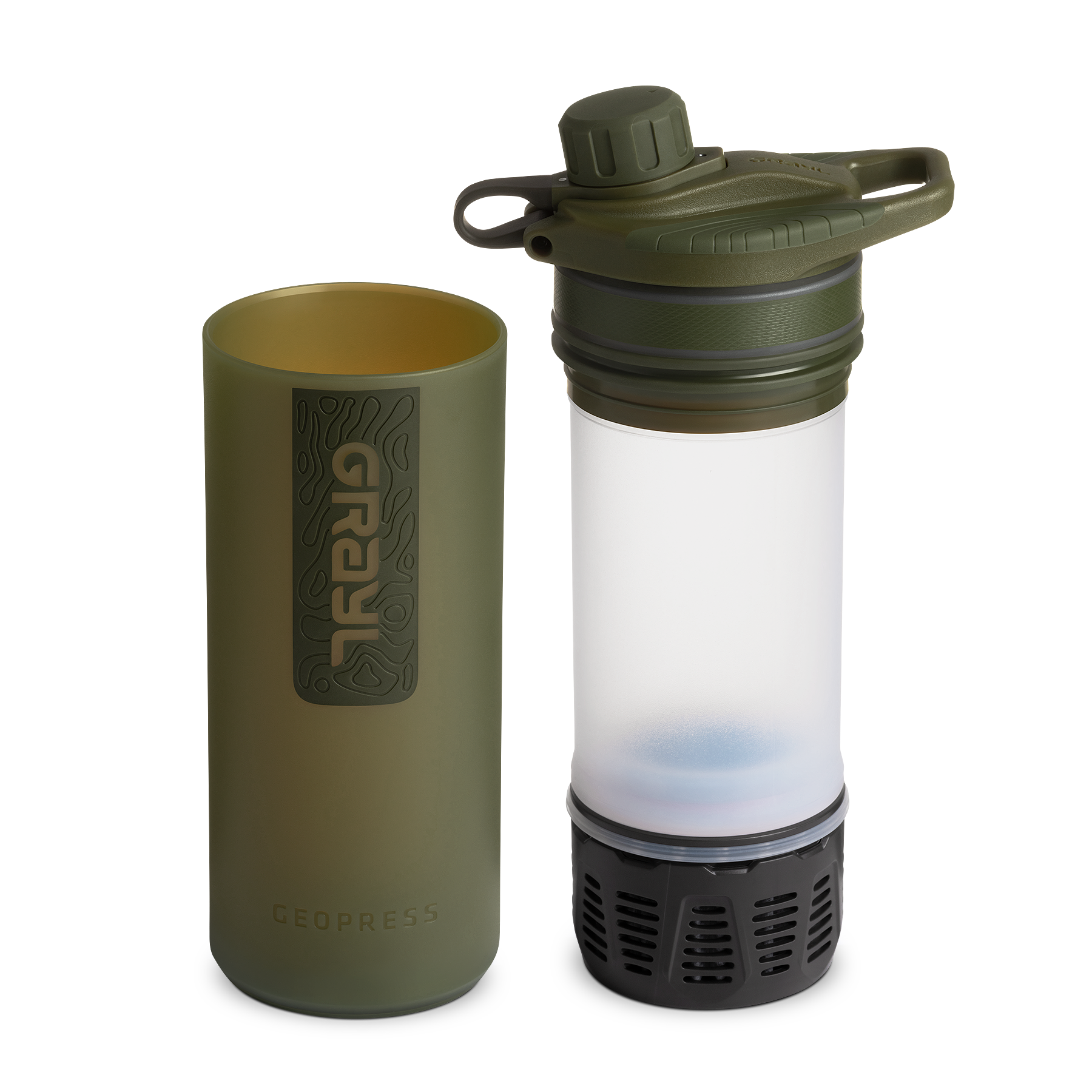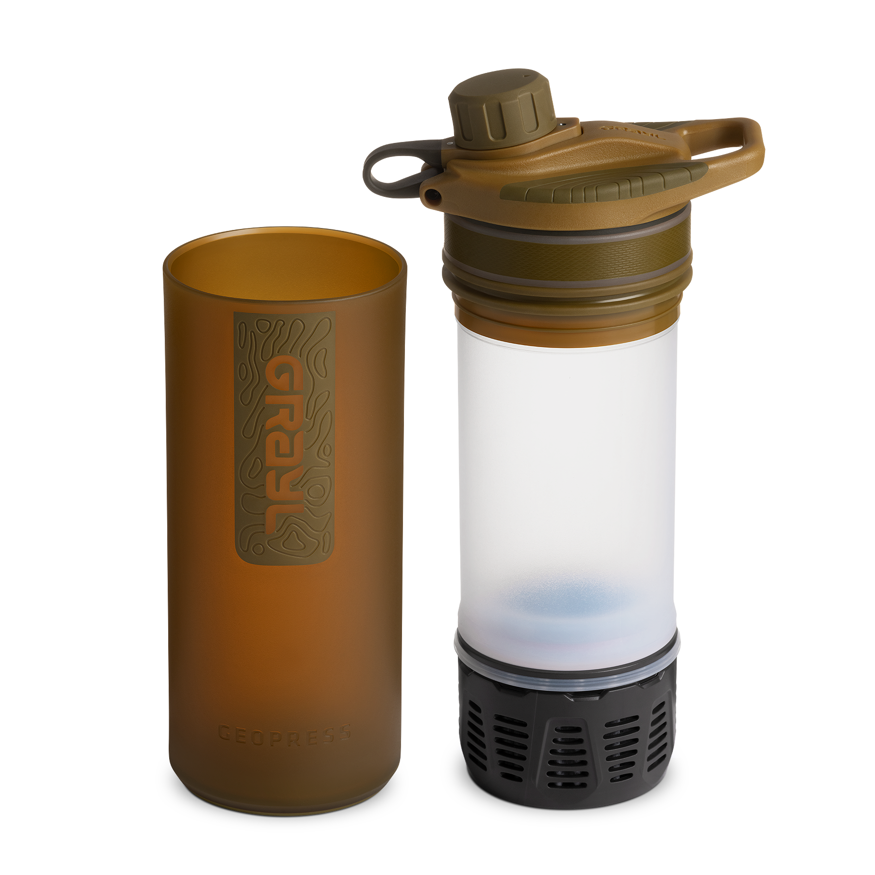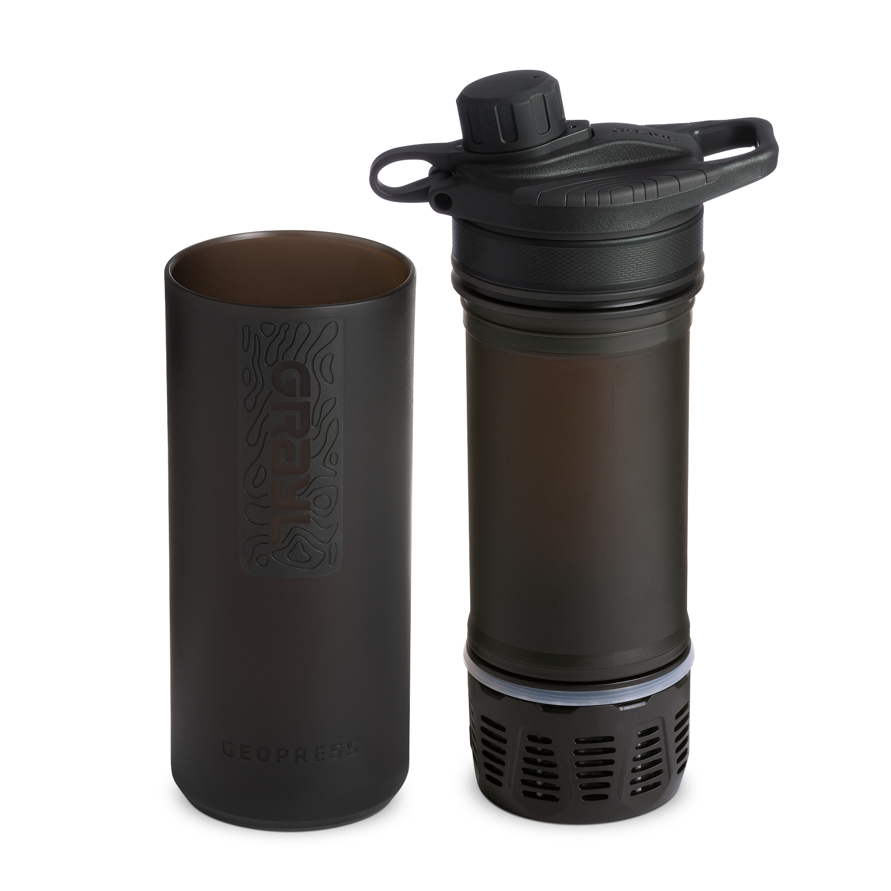 GeoPress® filters and purifies 24 oz of water, ideal for individuals and groups looking for a high capacity. UltraPress® purifies 16.9 oz and is great for individuals with limited space or when traveling with small pack side pockets.