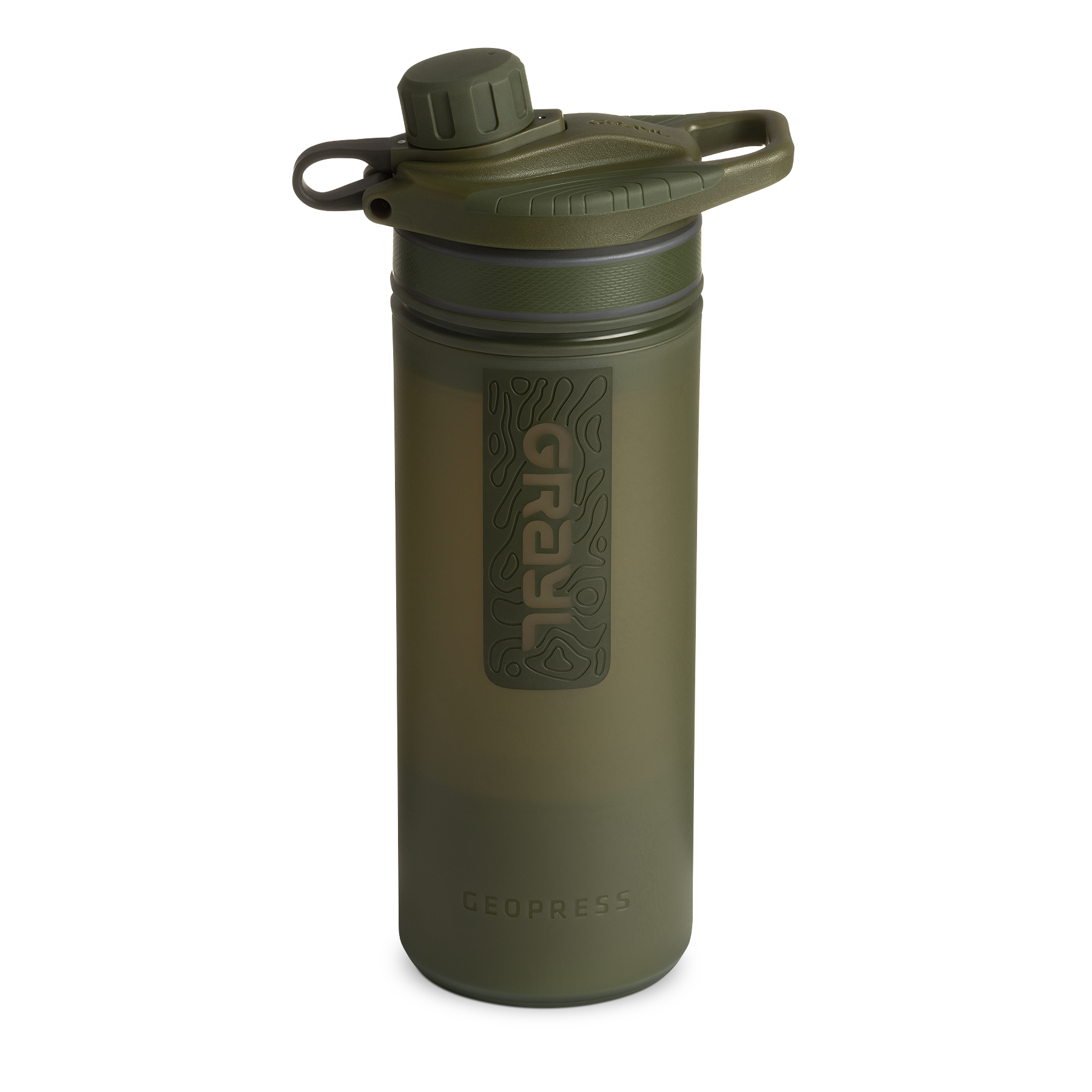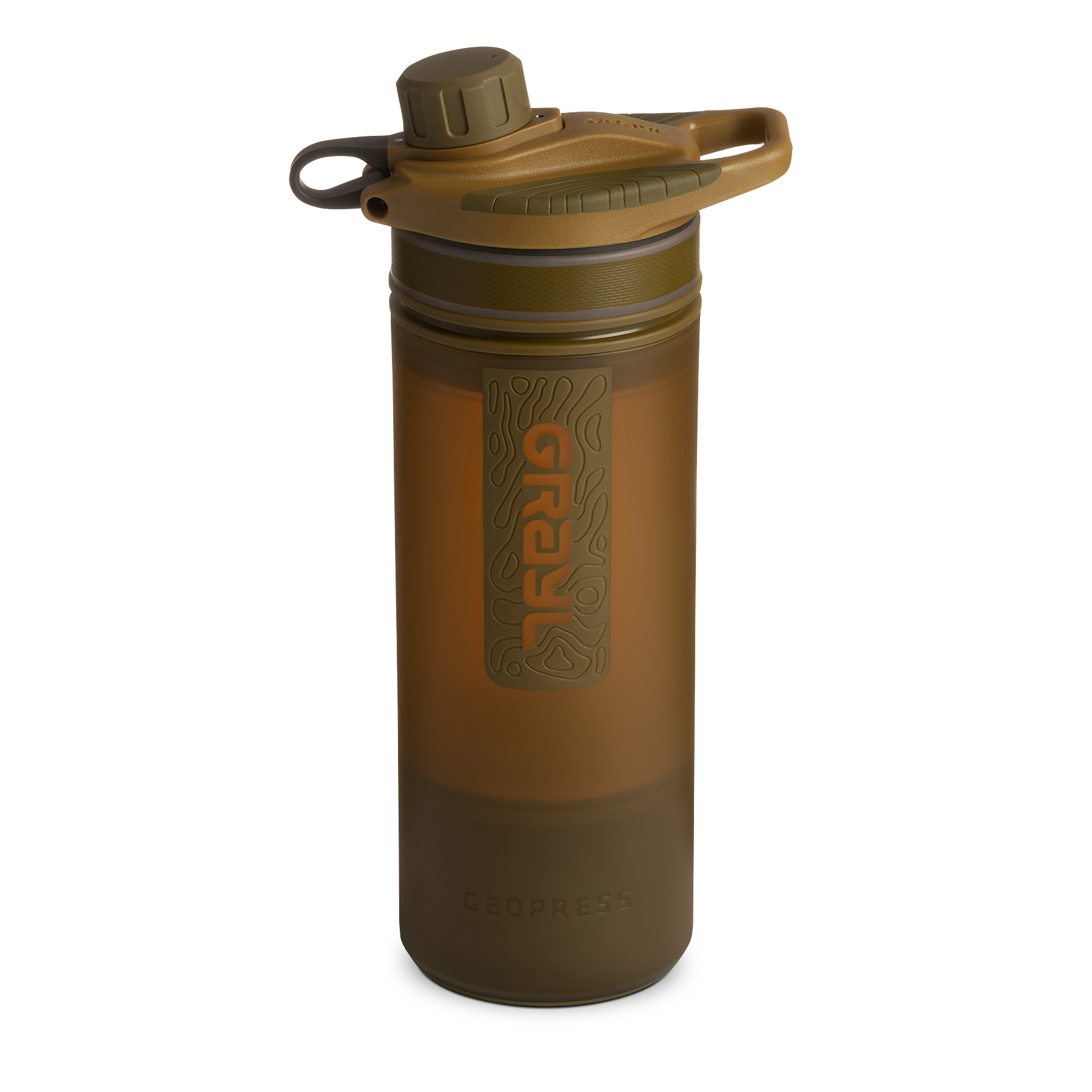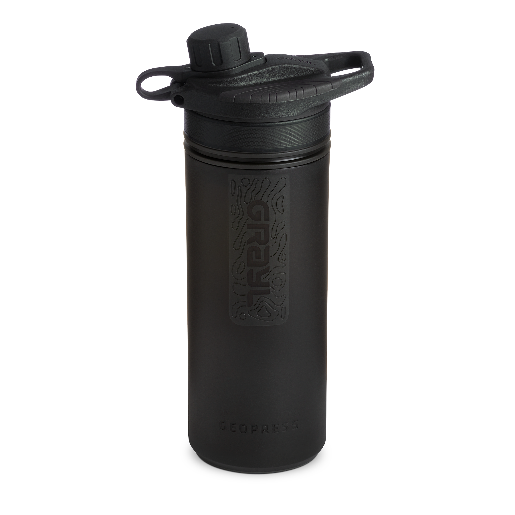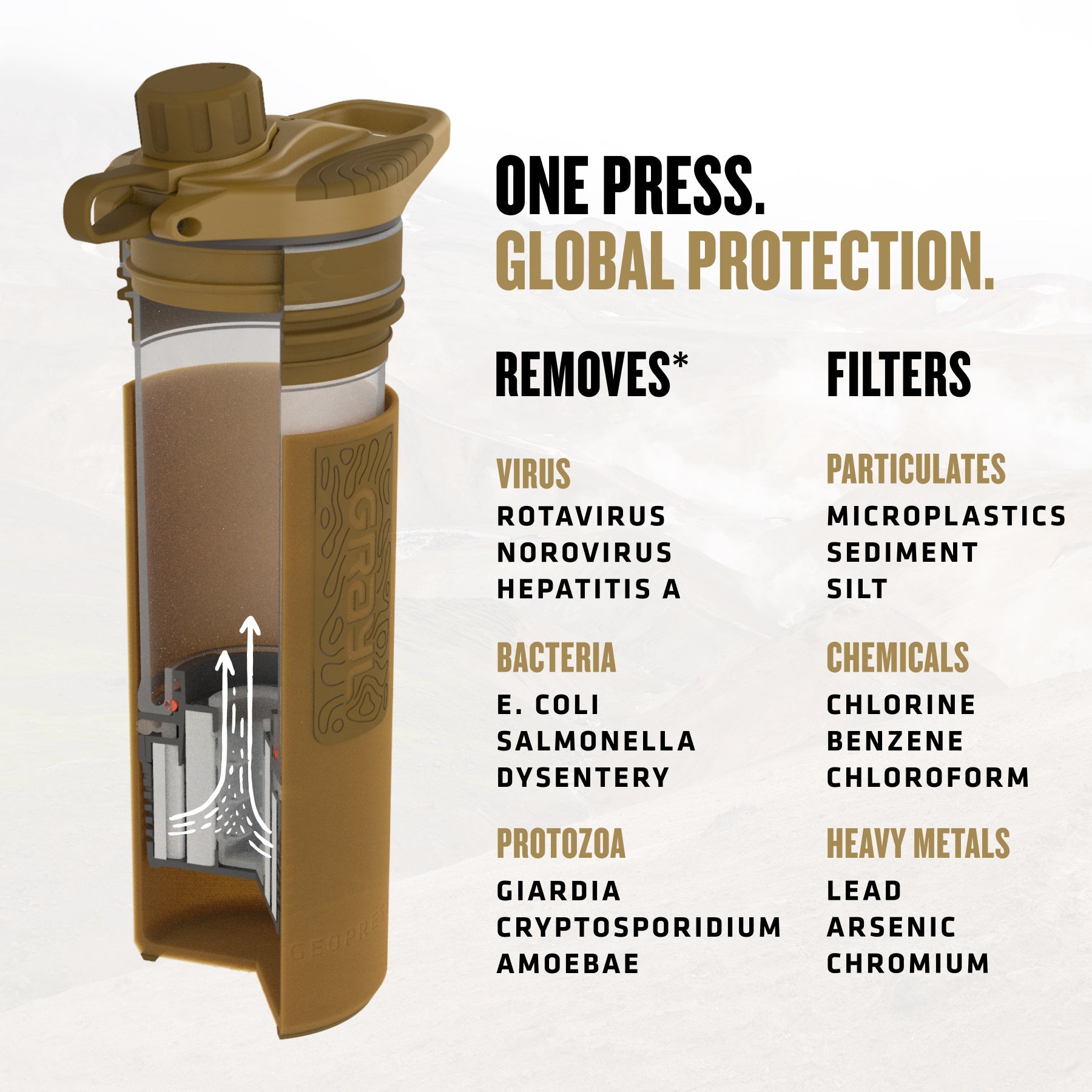GeoPress® filters and purifies 24 oz of water, ideal for individuals and groups looking for a high capacity. UltraPress® purifies 16.9 oz and is great for individuals with limited space or when traveling with small pack side pockets.