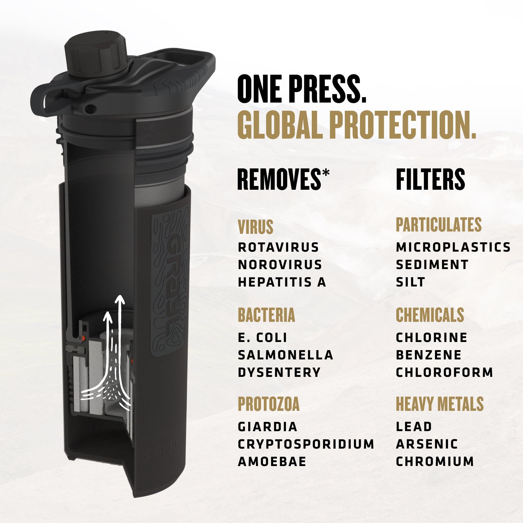 Purify Water. Anywhere. Requires zero setup time and makes 24 fl. oz. of clean drinking water in a blazing fast 8 seconds (5L/min) for quick and simple on-the-go filtration and purification. Make clean drinking water anywhere on earth with unrivaled ease, speed & convenience. Sip or chug, fill a hydration reservoir, or use for backcountry cooking. Removes global waterborne pathogens (VIRUS, bacteria, protozoan cysts) and filters pesticides, chemicals, heavy metals, and microplastics. Also improves taste, smell and clarity.