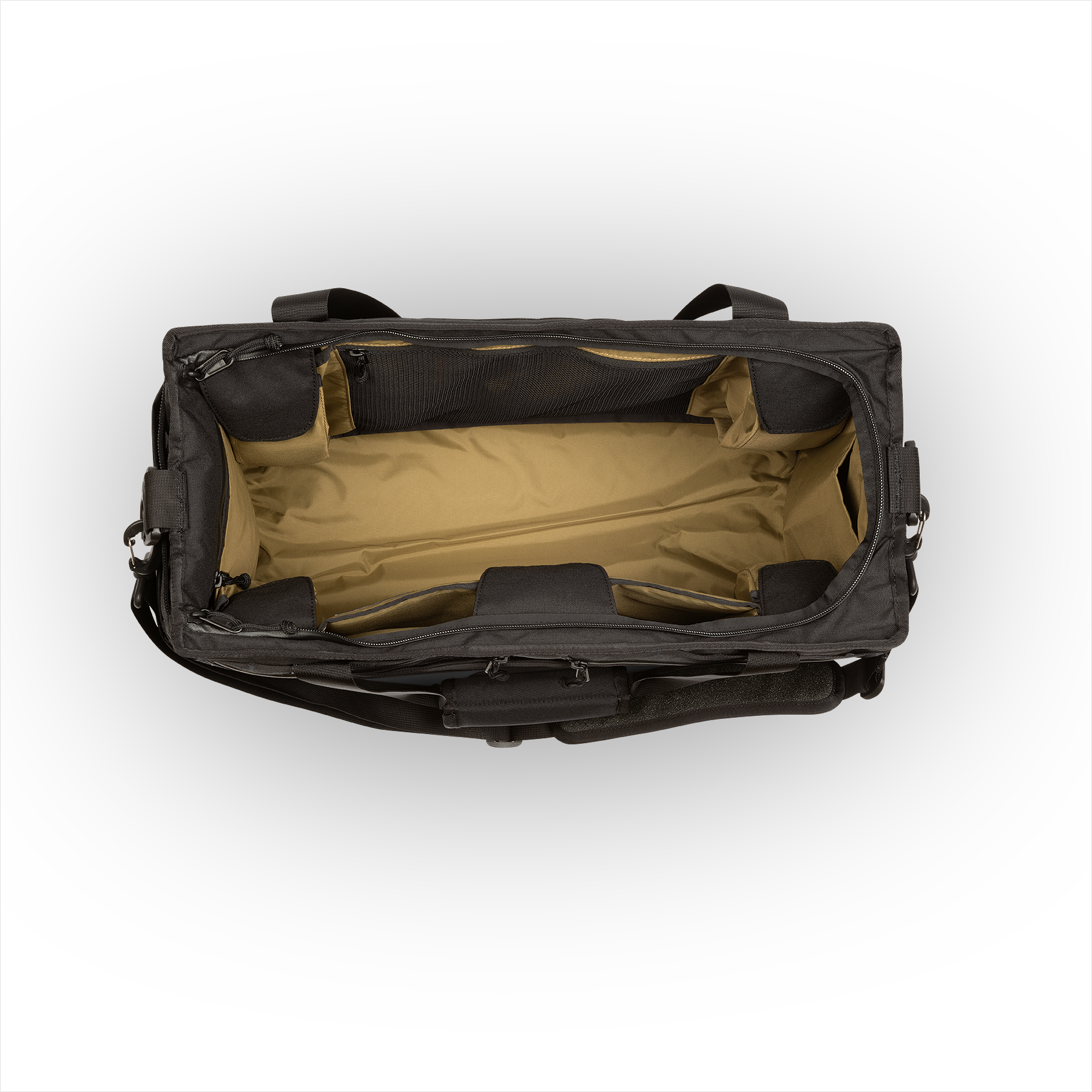 The Mission Tote has a series of internal bottle / accessory pockets with velcro closure flaps. It also has a perfect laptop and tablet 3D pocket with velcro closure. The internal design allows you to fully utilize the interior wall panels with pockets on each of the four sides.