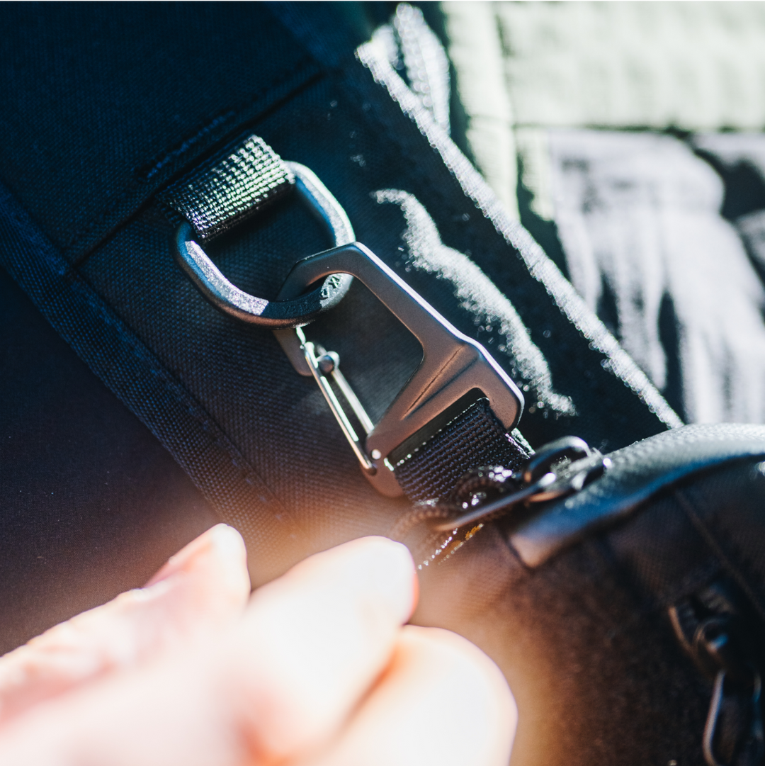 Our premium black powder-coated aluminum snap hooks clip into d-ring and o-ring receivers on most packs in the Carry Project lineup. Branches can snag, so clip it and forget it as your backup.