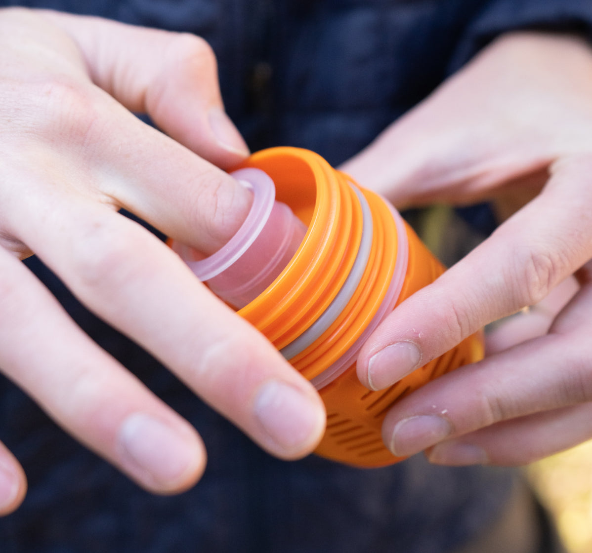 • Easy to remove for care and use between uses. Thoroughly dry a wet Cartridge by pressing into an empty (no water) Outer Cup, then dump any excess water. Remove the One-Way Valve and allow Cartridge to air-dry thoroughly (depending on humidity it will take 2-4 days to completely dry). Clean and dry the One-Way Valve, then reassemble UltraPress Bottle.