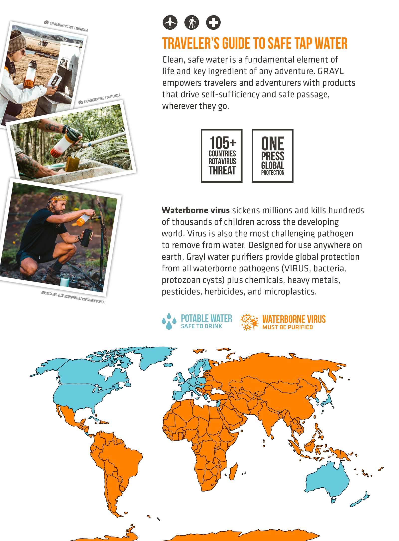 Waterborne viruses are found in all developing countries, infecting travelers and local populations – killing hundreds of thousands of children annually. Designed for use anywhere on earth, GRAYL purifiers provide global protection from all waterborne pathogens plus chemicals, heavy metals, and even microplastics.