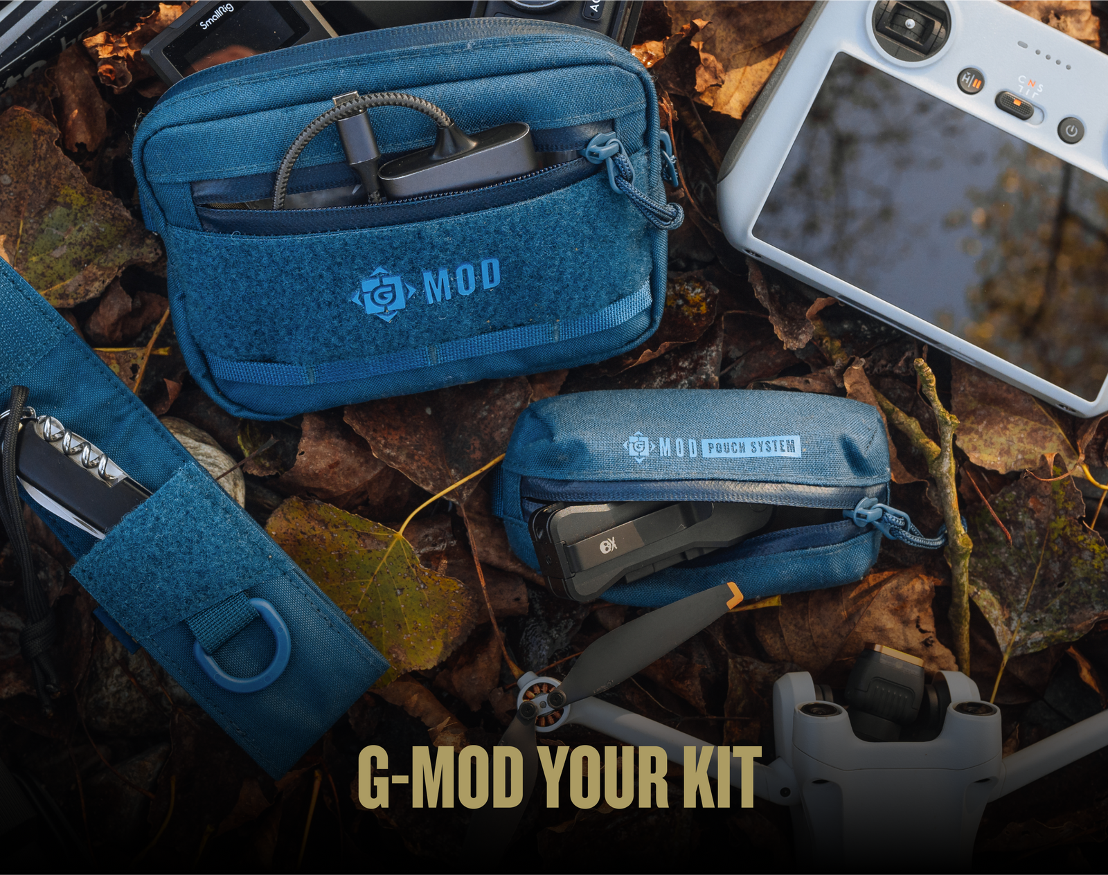 G-MOD Accessory Pouches pictured on forest ground next to a drone. Flat wallet pouch, Multi-tool pouch, and AirPod pouch picture along with assorted everyday carry tools.