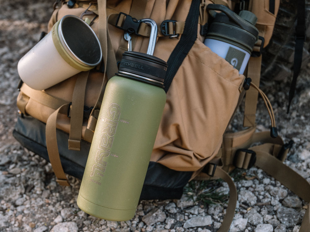 Grayl x Earthwell 32oz Kewler Bottle, Camp Cup and GeoPress equipped to a Mountainsmith backpack.