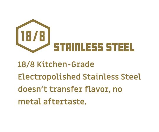 • 18/8 kitchen-grade electropolished stainless steel doesn't transfer flavor, no metal aftertaste